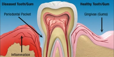 Diseases of the gum and bone (periodontal disease) can range from mild inflammation of the gum to rapid degeneration of the bone and loss of teeth. Common signs of periodontal disease can include bleeding gums, red or swollen gums, receding gums, or loose teeth. Often, there is no pain or even sensitivity associated with periodontal diseases. Most diseases are caused by bacteria and therefore cleaning is the first stage of treatment.